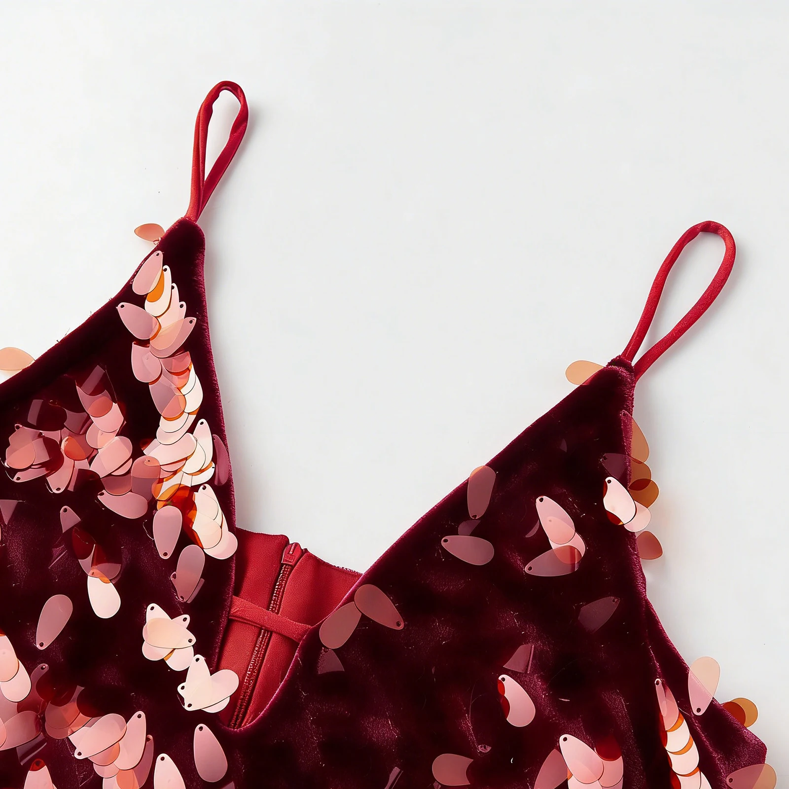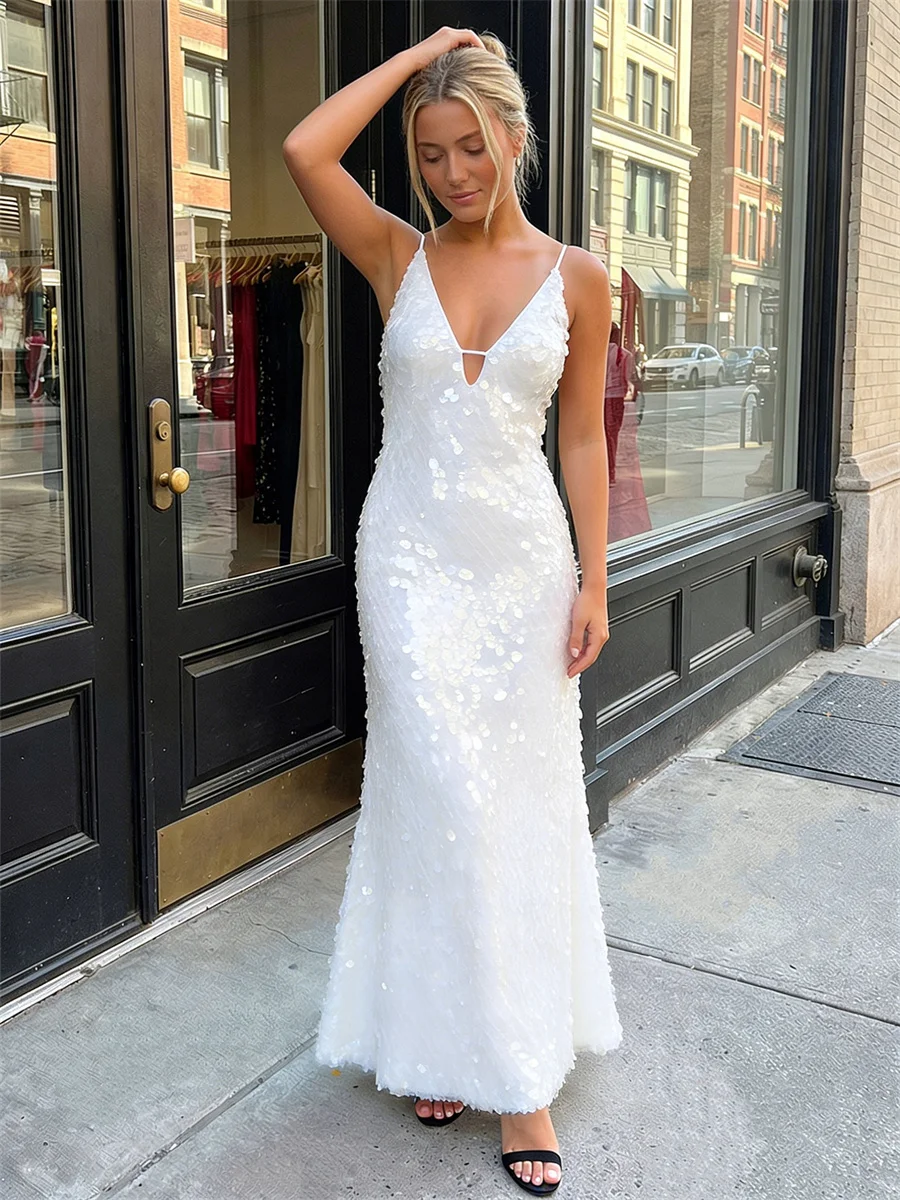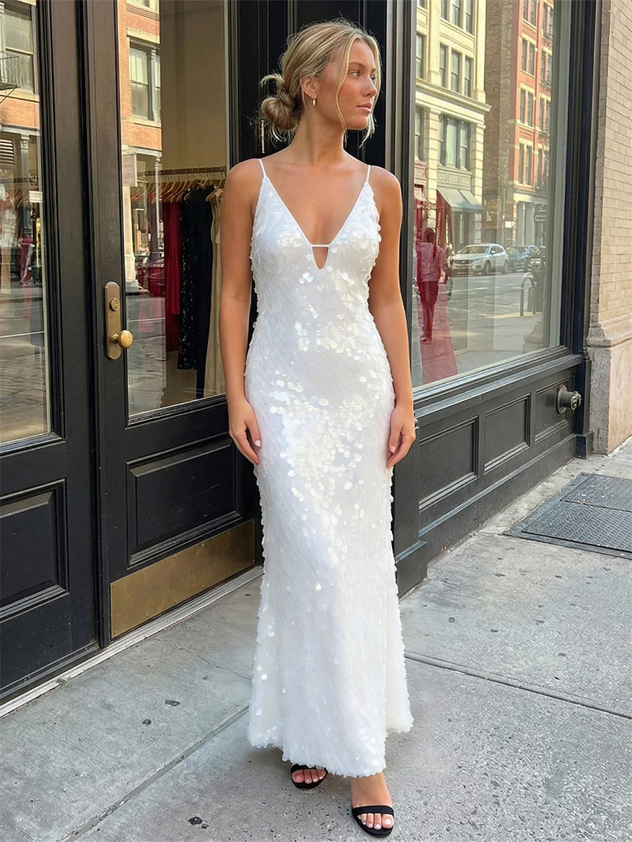 Women’s Summer Long Dress Elegant Sleeveless Deep V Neck Spaghetti Strap Sequin Dress for Party Date Night Wear