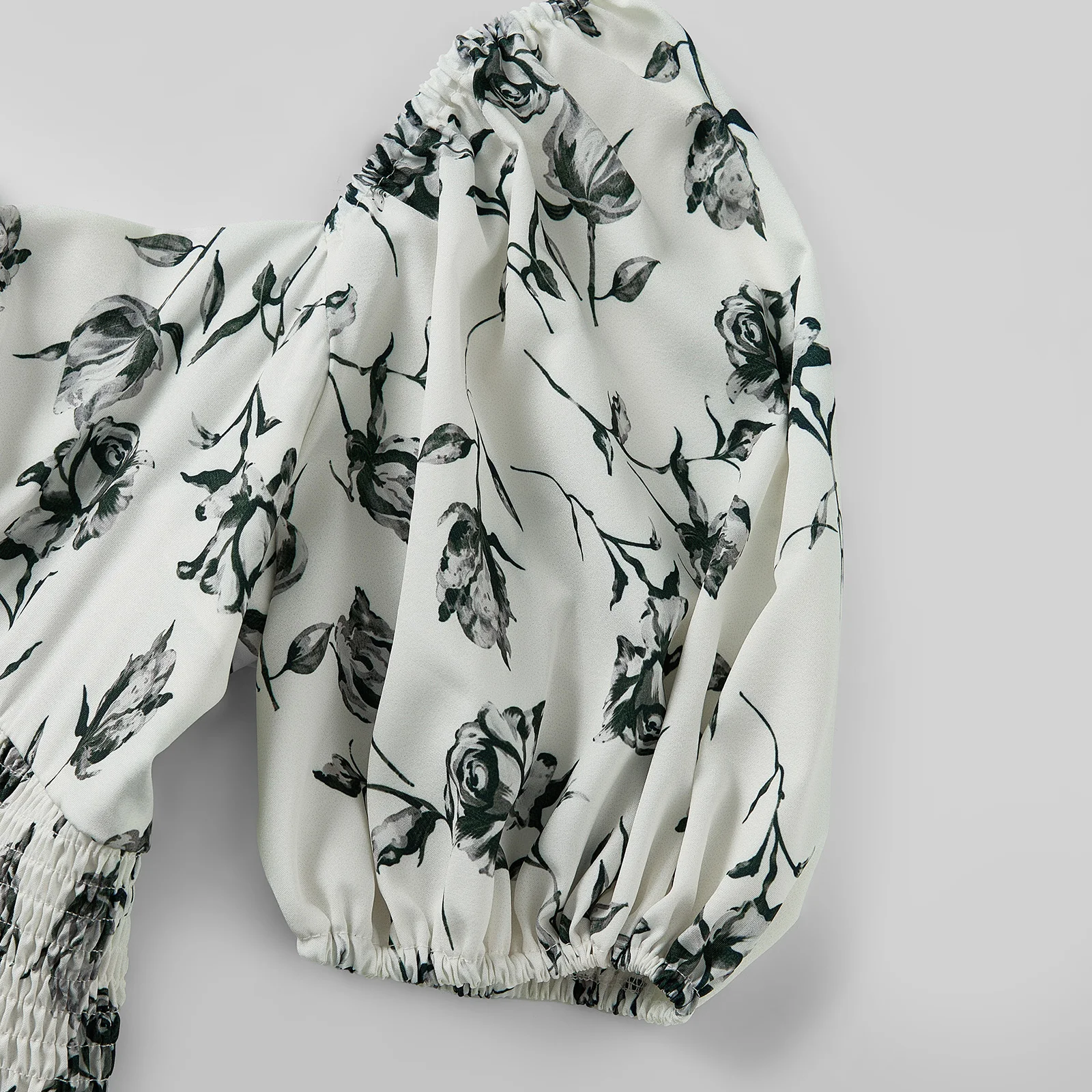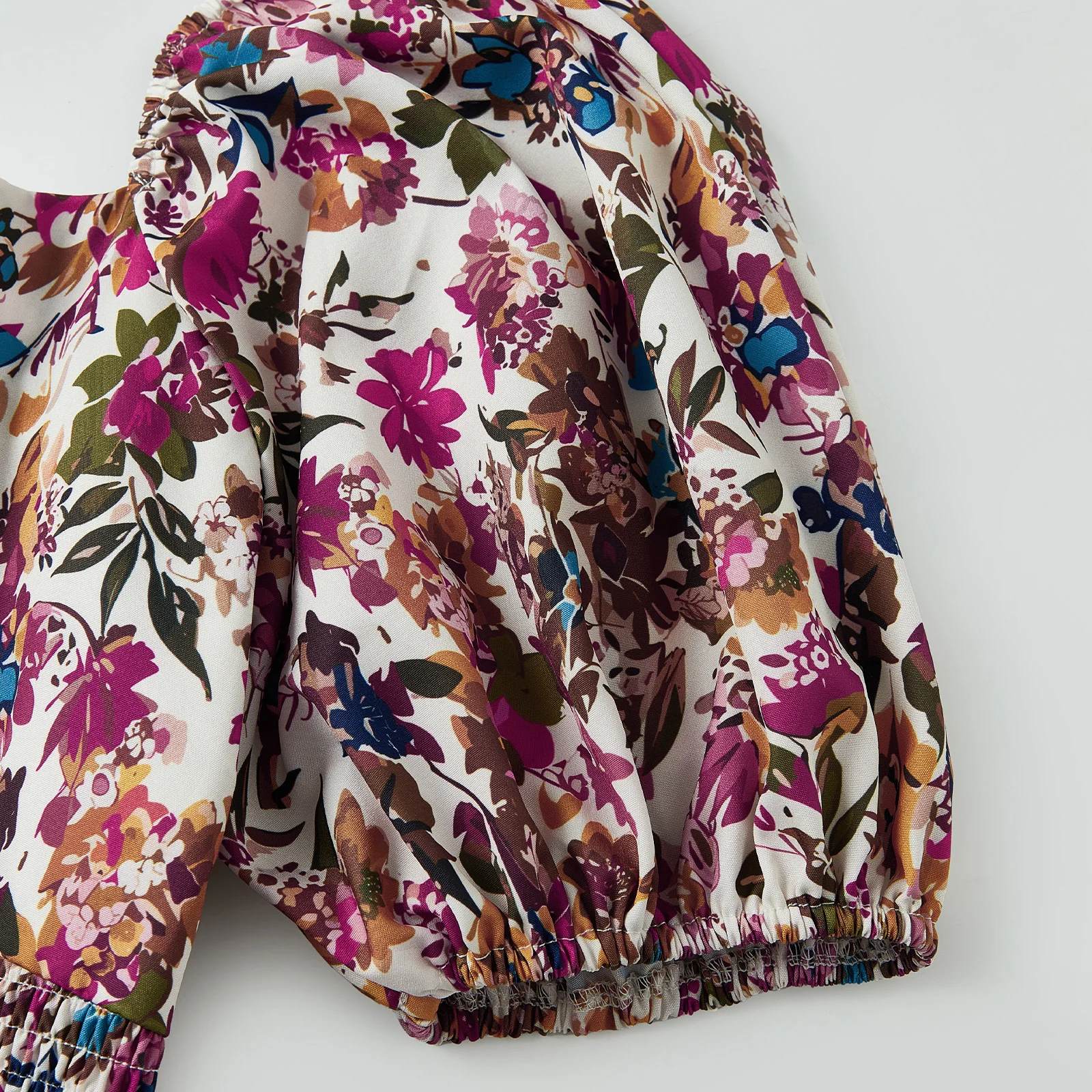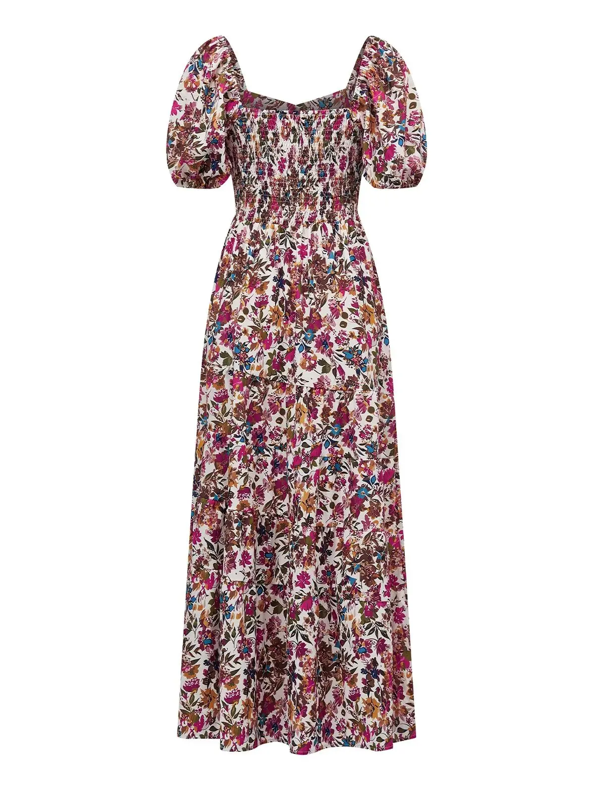 Floral print, sweetheart v-neck, bubble short sleeves, high waist, ruffle hem, A-line and ankle length design; Casual dress with sleeves; Elegant dresses for women, highlighting feminine charm