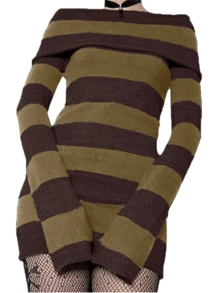 Women Autumn Dress Striped Boat-Neck Long Sleeve