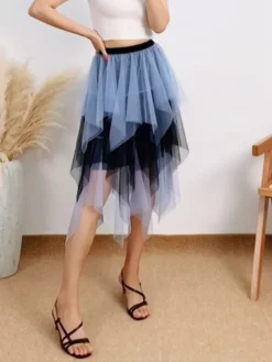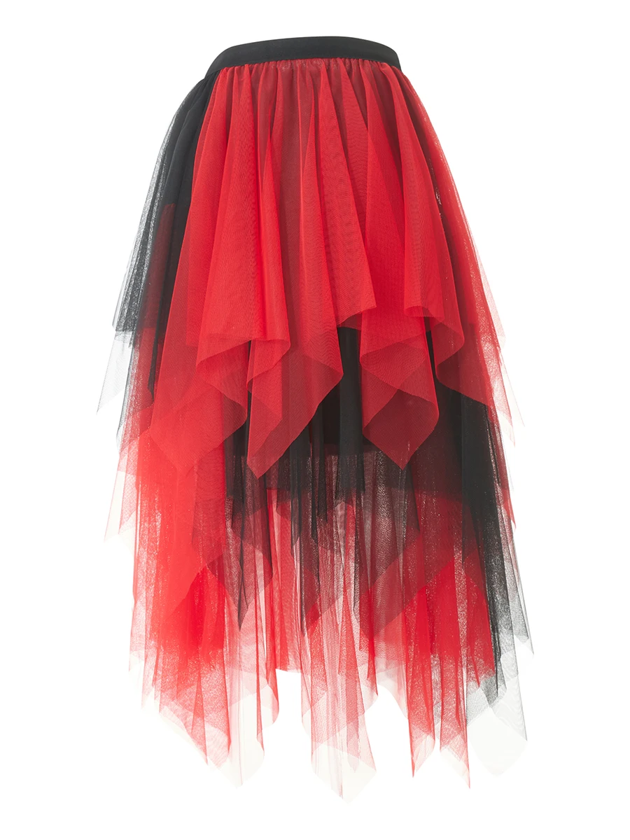 Women Fashion Midi Skirts Contrast Color/Solid Color Elastic High Waist Irregular Ruffles Multi-Layered Tulle Tutu Skirts