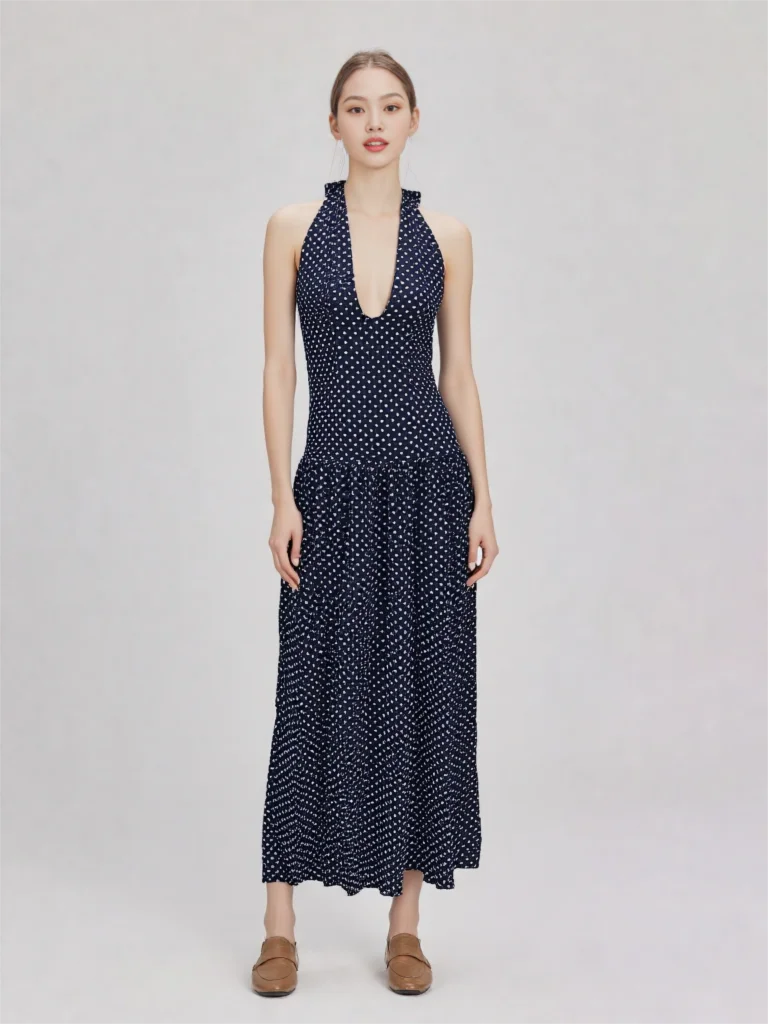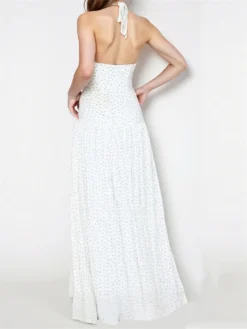 Women Long Dress, Sleeveless Halterneck Backless Dots/Floral Slit Dress for Cocktail Party
