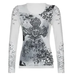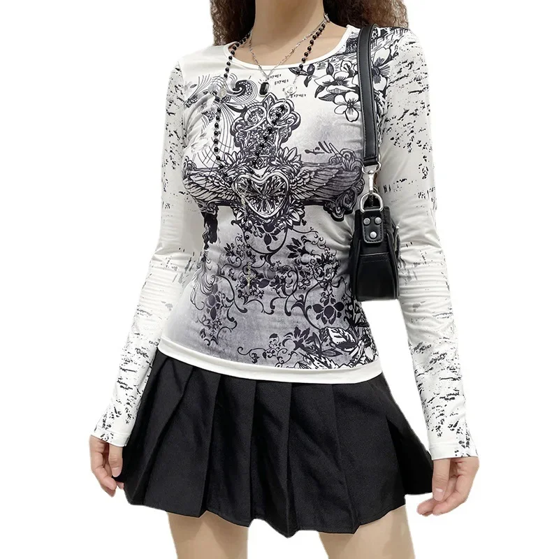 Womens Round Neck Tight Tops, Vintage Heart Wings Print Long Sleeve Slim Fit T-Shirts