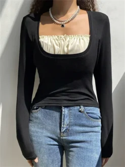 Women Shirts Fake-2-Piece Long Sleeve Square Neck Tops Autumn Gothic Grunge Y2K Aesthetic T-shirt Streetwear
