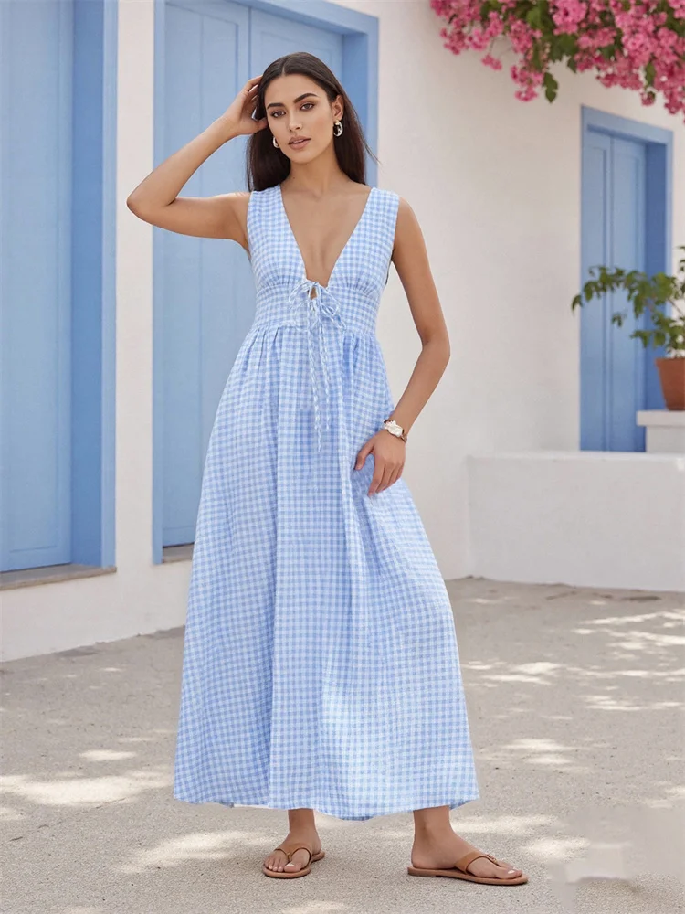 Stripe/plaid print, bandage and deep V-neck, sleeveless, high waist; Casual dress for women; A-line and ankle length, easily show off your charming curves, a perfect addition to your closet