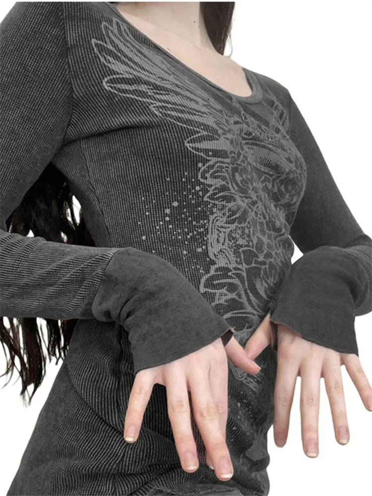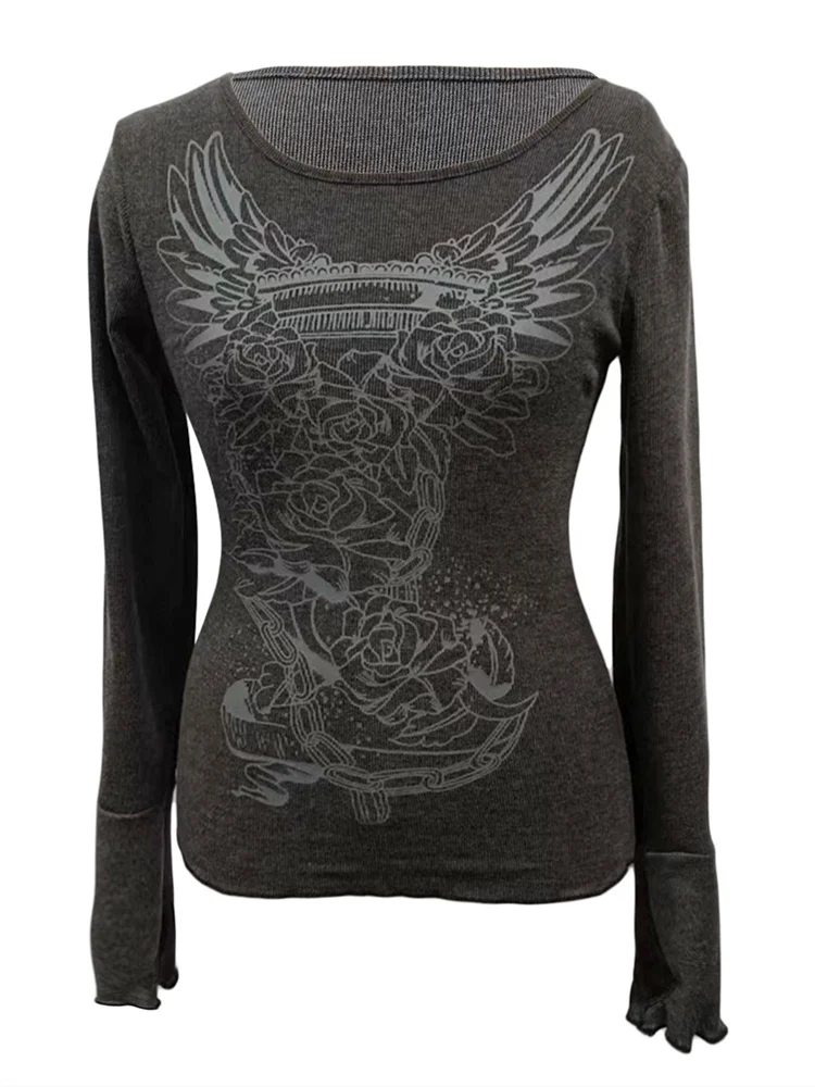 Women T-shirt, Vintage Long Sleeve Crew Neck Flower Print Slim Fit Ladies Tops for Casual Daily