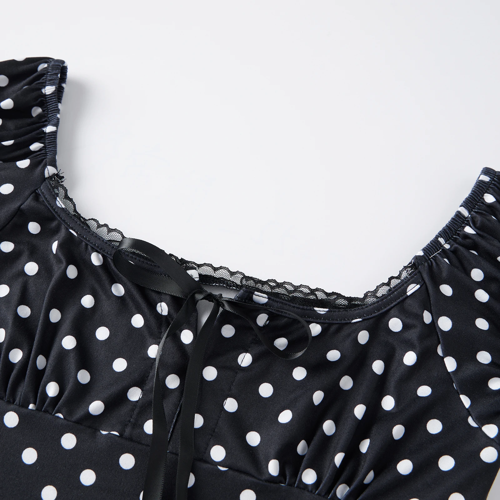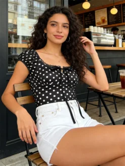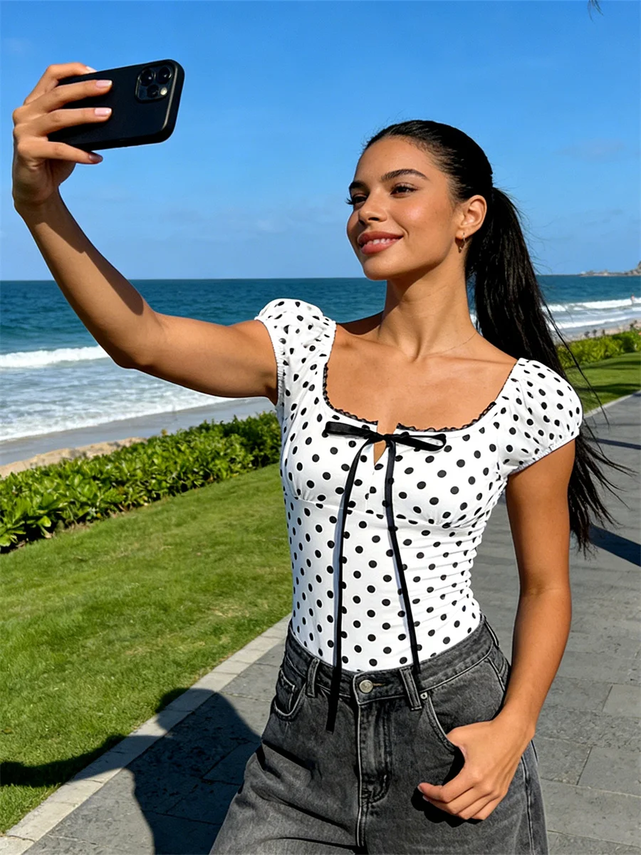 Women's Dot Cap Sleeve Tops Summer Casual Fashionable Square Neck Slim Fit T Shirt