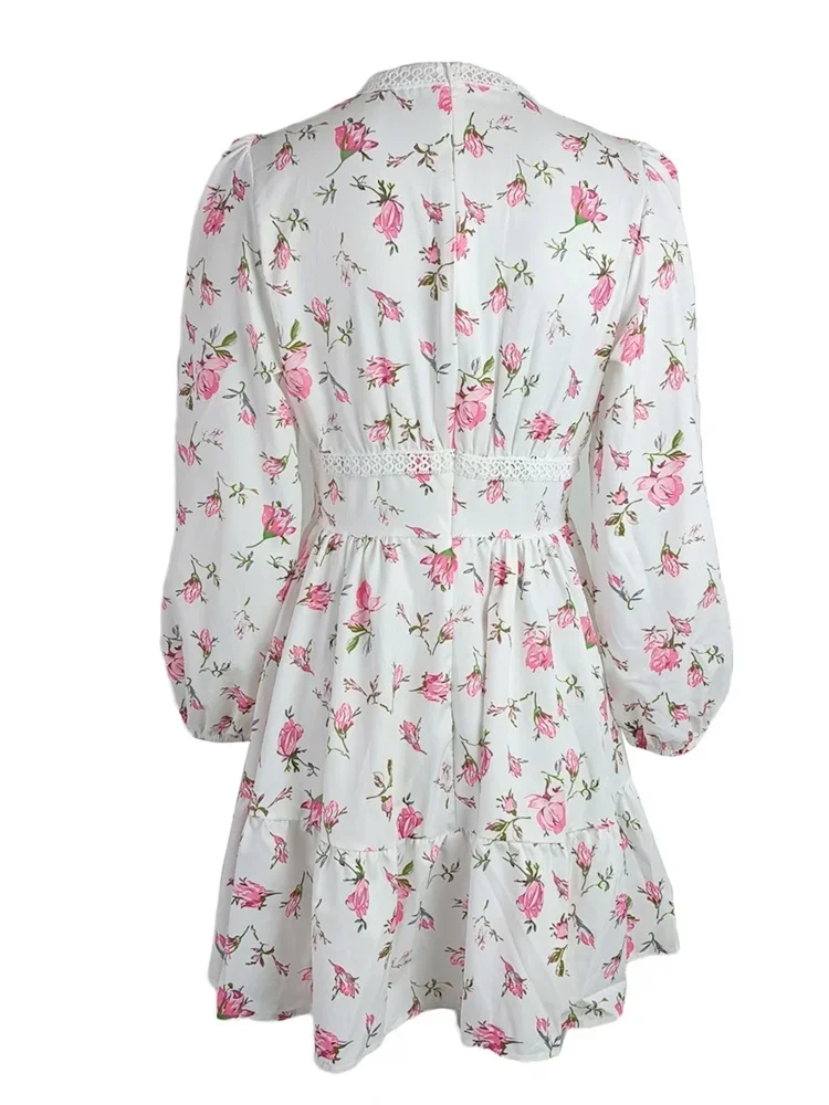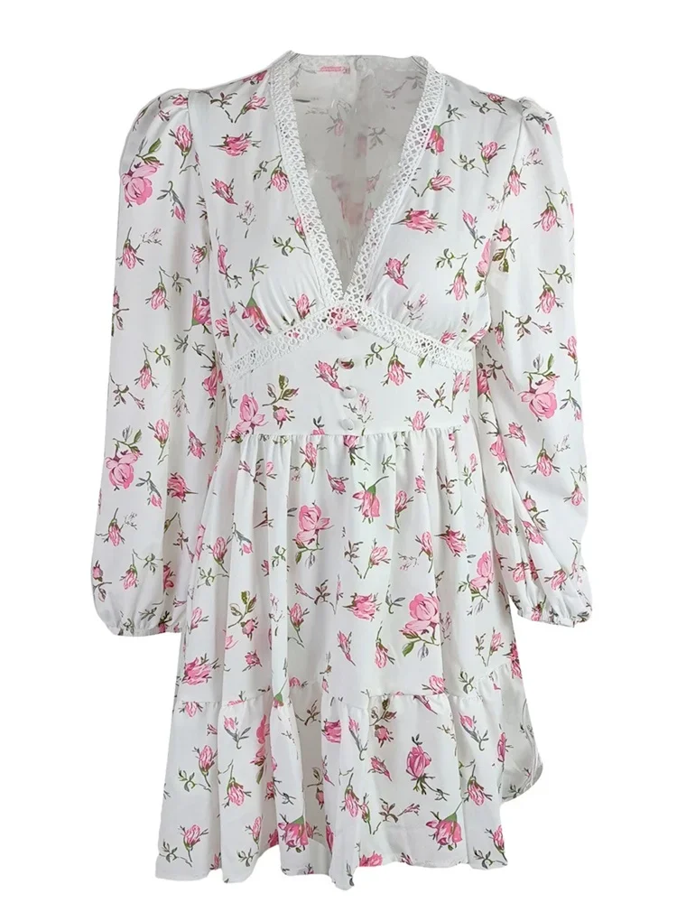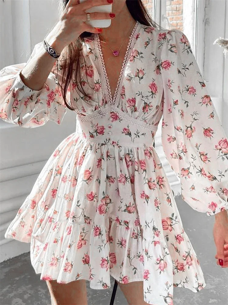 Womens Floral Print Mini Dress, Summer Long Sleeve Deep V Neck High Waist A-Line Dress