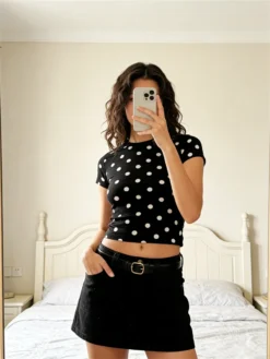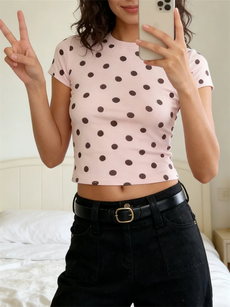Women’s Summer Crop Top Short Sleeve Round Neck Dot Pattern Slim Fitted T Shirt Streetwear